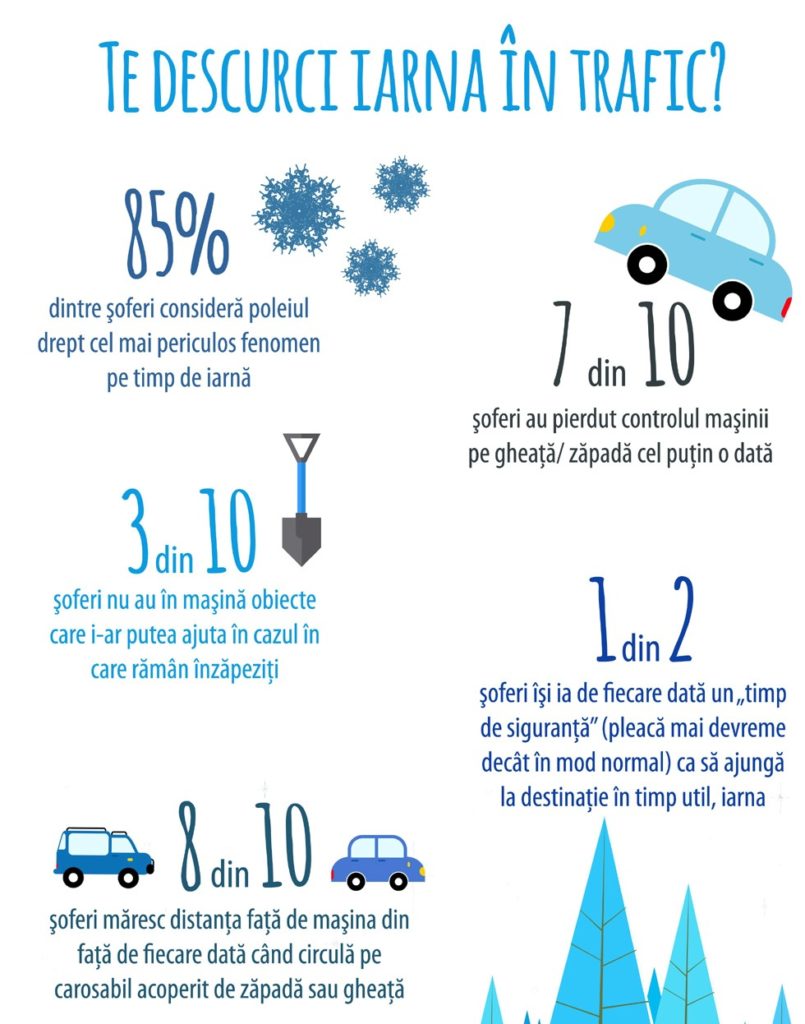 Un număr 7 şoferi din 10 au pierdut controlul maşinii pe gheaţă sau zăpadă cel puţin o dată, în timp ce poleiul este menţionat de 85% dintre şoferi drept cel mai periculos fenomen pe timp de iarnă.